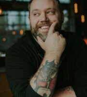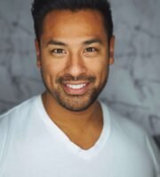 An abstract artwork with swirling colors and dynamic splatters. Vivid blue and green tones blend into shades of purple and red, with scattered dots and streaks of yellow, orange, and black adding texture and movement.
